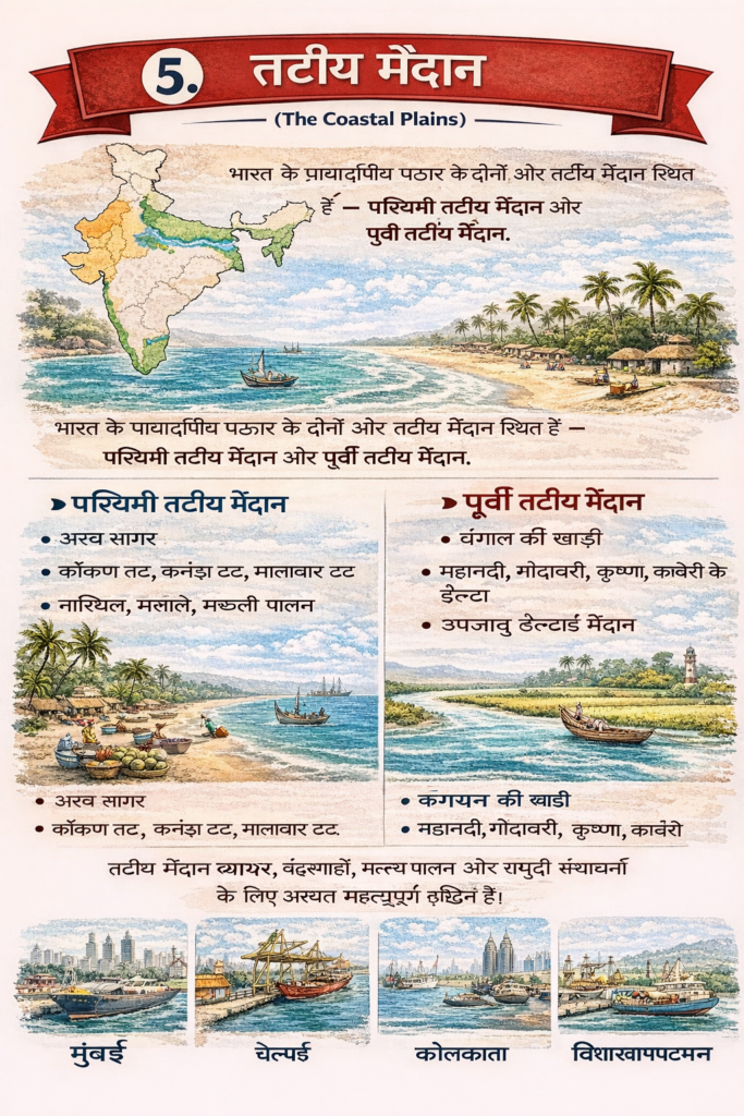 5️⃣ तटीय मैदान (Coastal Plains)