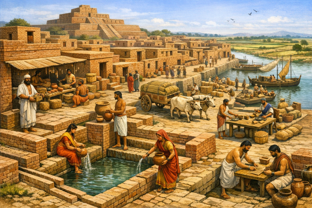 Indus Valley Civilization, जिसे हिंदी में सिंधु घाटी सभ्यता कहा जाता है, लगभग 2600 ईसा पूर्व विकसित हुई और अपनी उन्नत नगर व्यवस्था, स्वच्छता प्रणाली और व्यापारिक संरचना के लिए प्रसिद्ध रही।